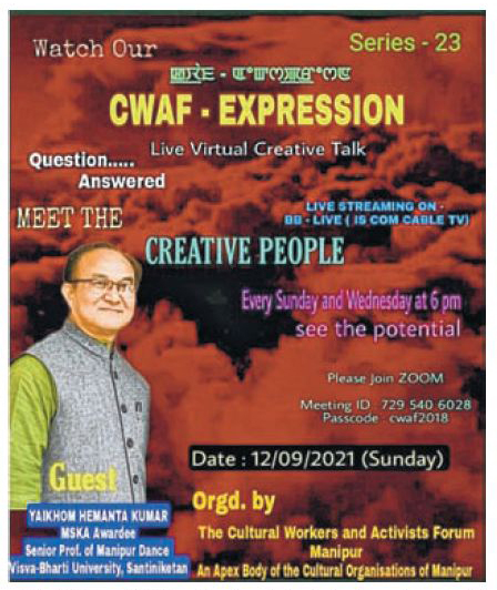 হায়রিবা পুন্সীনা মালেমদা হেক খোঙদারকপদগী মৈতৈ পুঙ, জগোই, ঈশৈনা য়োমদুনা লাক্লবা থোইদোক হেন্দোক্লবা আর্টিষ্ট অসিগা দি কালচারেল ৱার্কাস এন্ড এক্টিবিষ্ট ফোরাম মণিপুর (ক্বাফ মণিপুর), মণিপুরগী কালচারেল অর্গানাইজেশনশিংগী এপেক্স বোডি অমা ওইরিবা অসিনা পেন্ডেমিক অসিগা মরি লৈননা ভার্চুয়েল প্লেটফোর্ম অমদা শিনবা কালচারগী আইকোন ওইনা লৈরবা মীওই কয়া উনবগী থৌরম ‘ক্বাফ এক্সপ্রেসন’ গী থৌরমদা উনখি। থৌরম অসিগী ২৩শুবা সিরিজ ‘মিট দি ক্রিয়েটিব পিপল’ য়াইখোম হেমন্তগা পুং ২ হেন্না ৱারী ৱাতাই চত্থখি। মণিপুরগী ঈশৈ নোংমাইগী অচৌবা সংস্থান অমা ওইরিবা রিদমস অব মণিপুরগী আরকে সনাতোম্বা ক্বাফ মণিপুরগী জেনারেল সেক্রেটারিসু ওইরিনা ৱারী ৱাতাইগী মরু ওইবা থৌদাং লৌদুনা প্রোফেসার য়াইখোম হেমন্তগী কলাগী খোঙচৎ অদু মরিক চুম্না ভার্চুয়েল অডিয়েন্সশিংদা পাউদমখি।